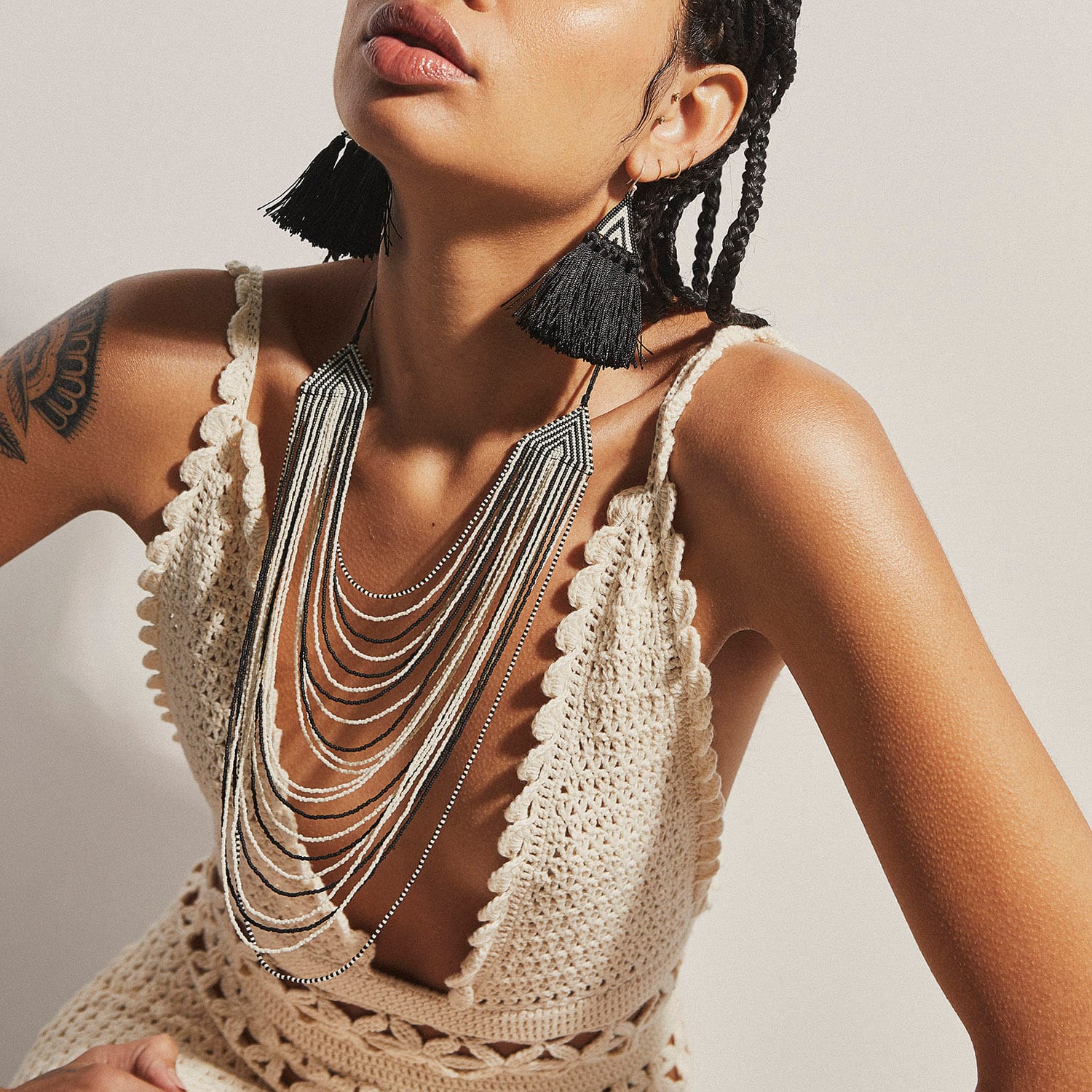 Behold the wonderful collection, known as “CHAQUIRA SALVAJE, Ritual Techniques’, which embodies the ancient art of weaving magical Toho beads into fascinating Amazonian patterns. Through the act of weaving, knotting and creating ties, we enter a sacred space of connection of worlds and transcendence of borders. These beads, or chaquira, carry a rich history dating back to the time of the European conquest and were once used as a means of mystical communication with the feminine energies of the universe. It is said that through the exchange of beads and knowledge a powerful alchemy is produced, revealing the divine secrets of design and technique. In this collection, we seek to honor this ancient tradition by capturing the untamed spirit of the Amazon, weaving a tapestry of mysticism and wonder.