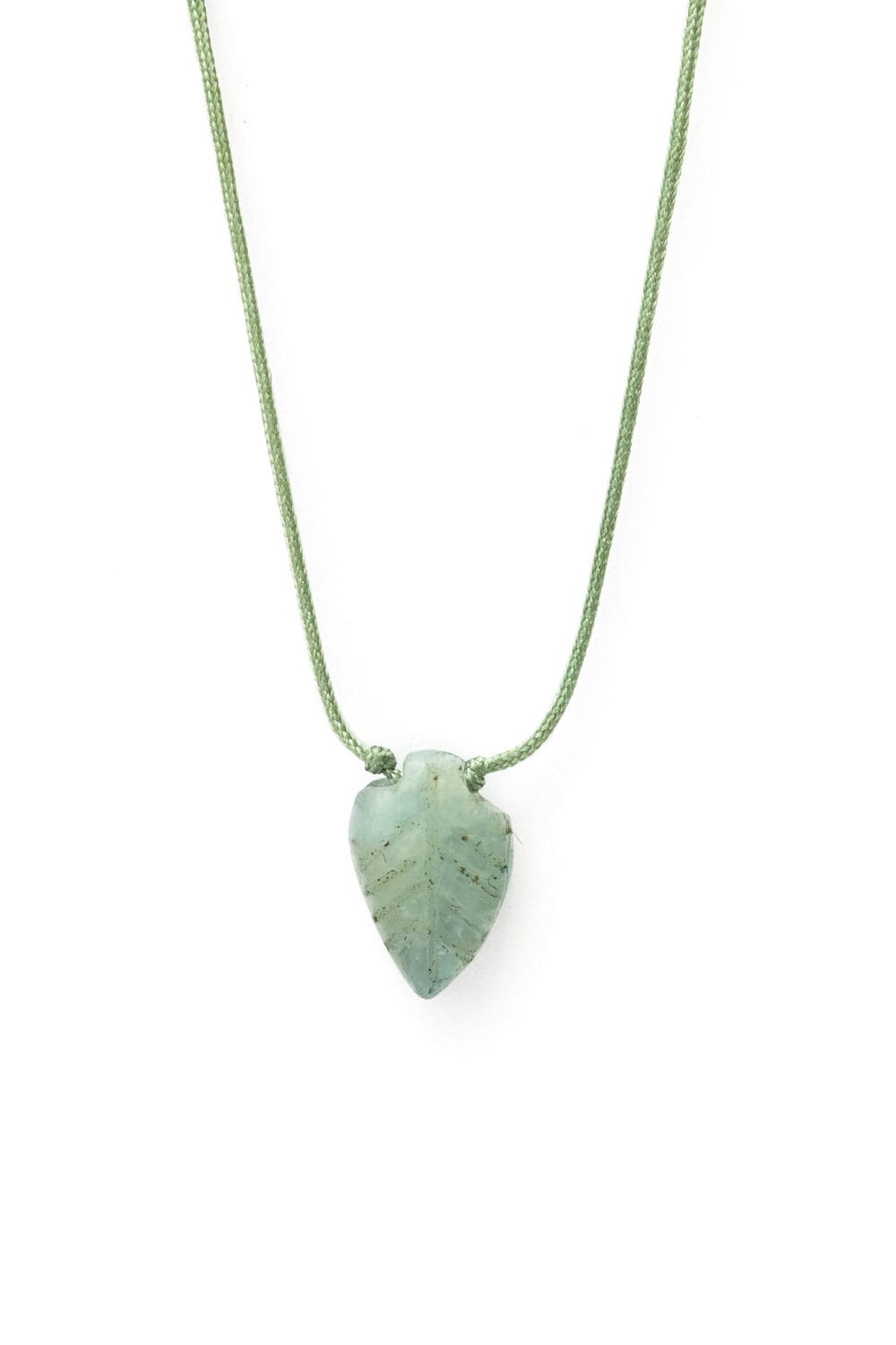 Aquamarine leaf necklace on satin cord and silver clasp.