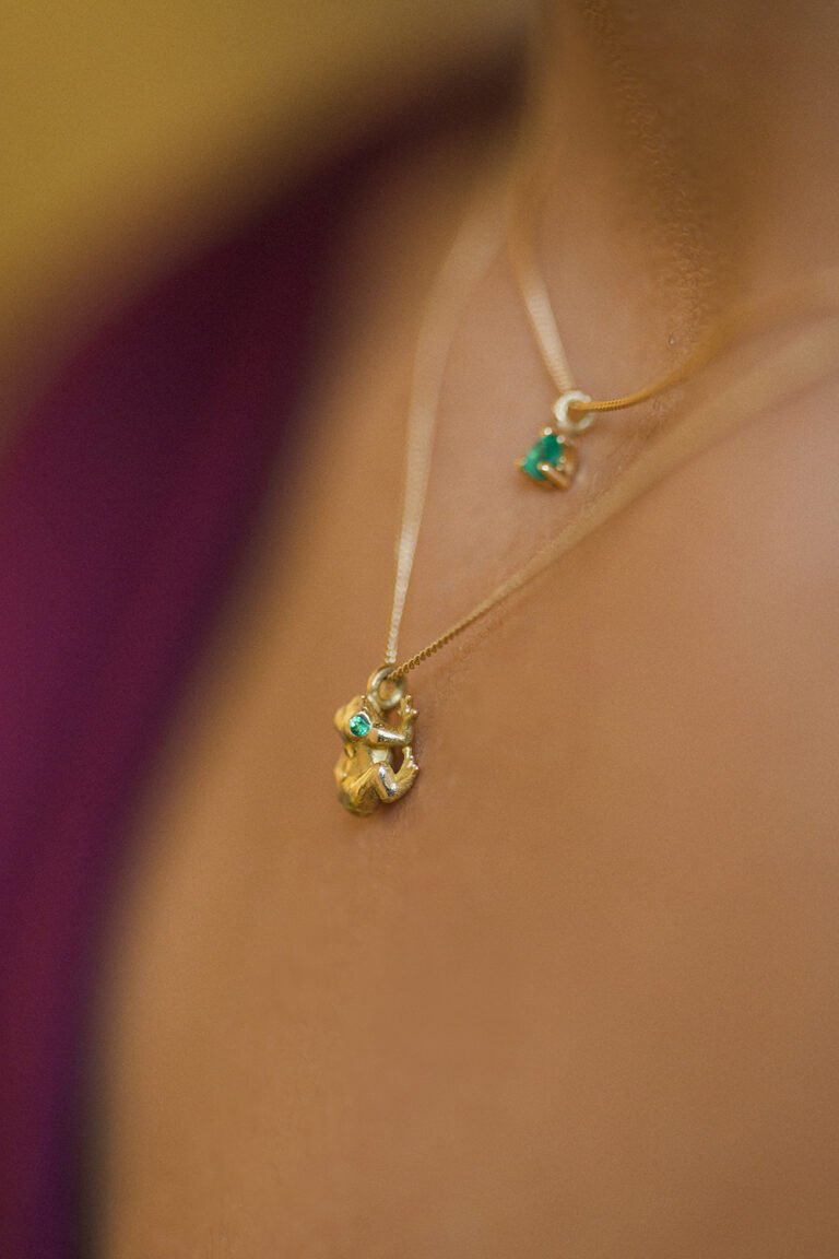 Necklace with chain and frog pendant in 18kt gold and emerald. Frog: 8*9mm. Emerald: 1.1mm. Chain: 45cm