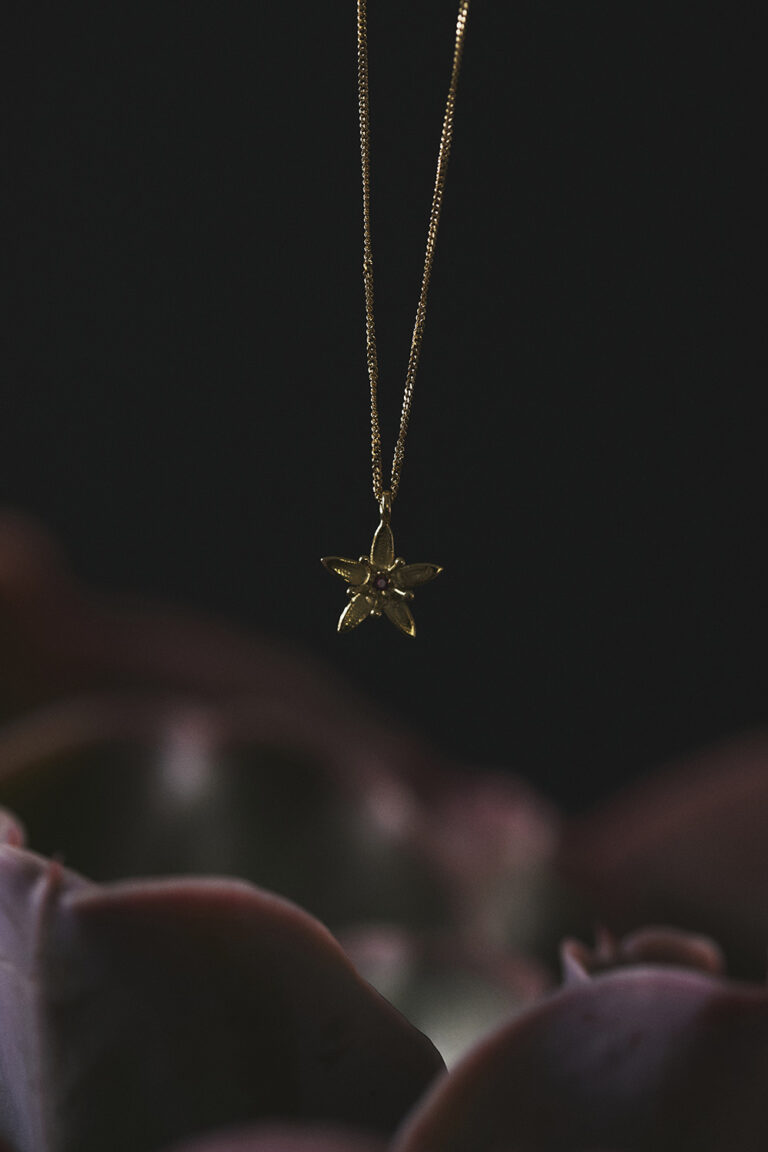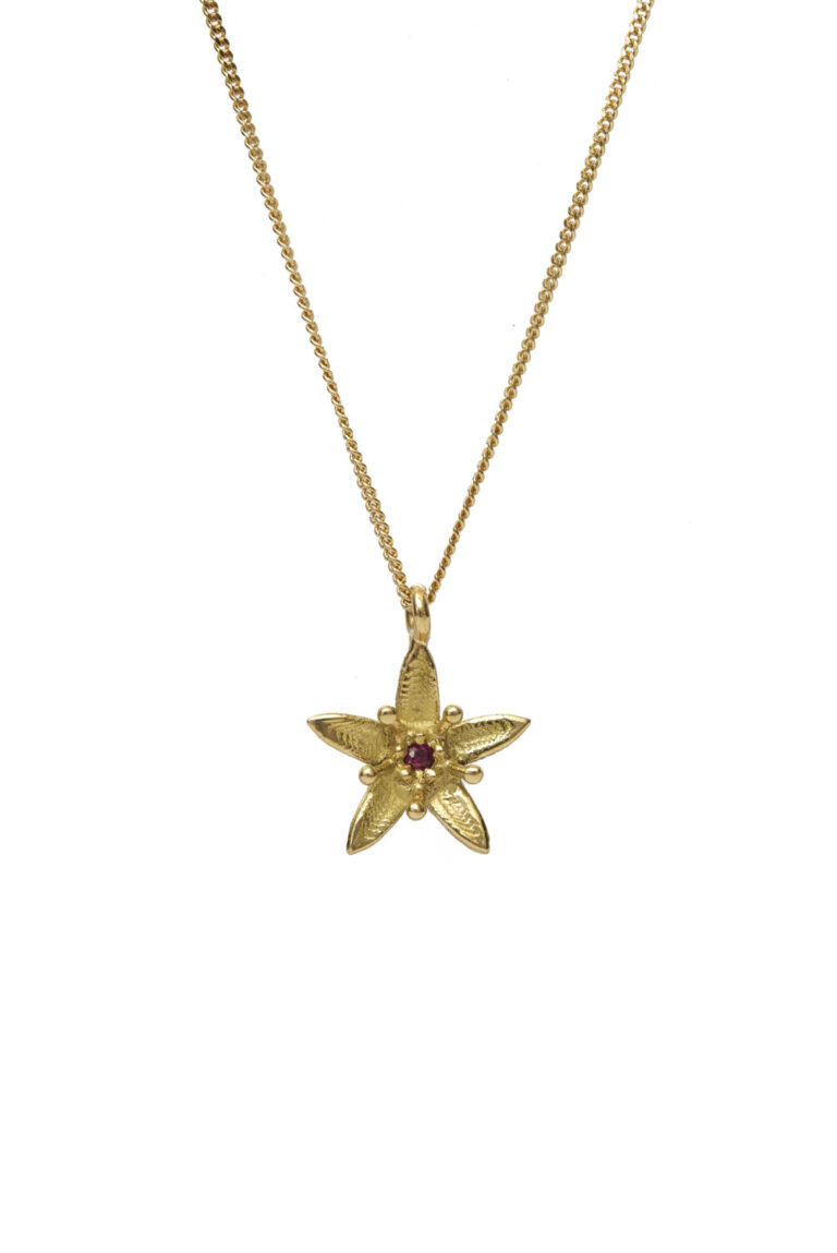 Jade flower pendant necklace with a central ruby in 18kt gold.