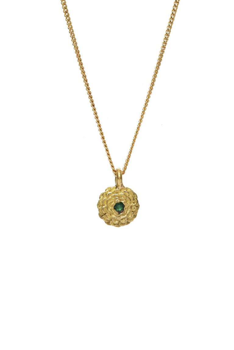 18kt gold Jericho flower pendant necklace with an emerald in the center.