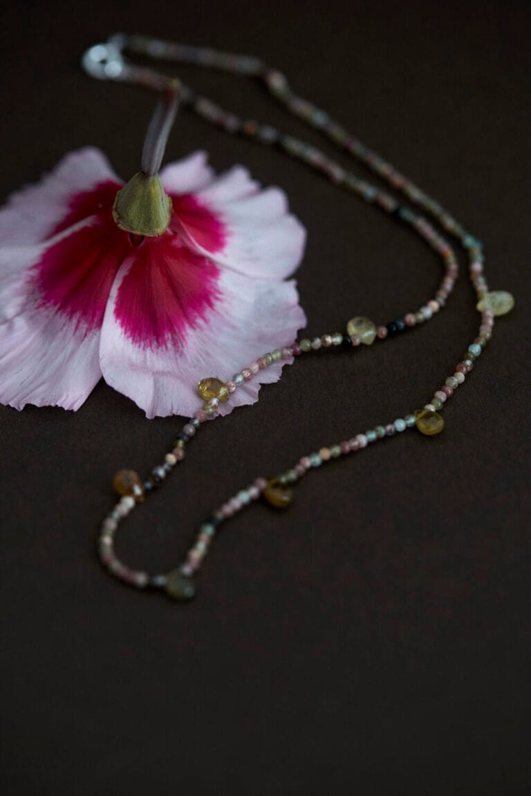 Necklace of colorful tourmalines and green garnet drops with silver clasp.