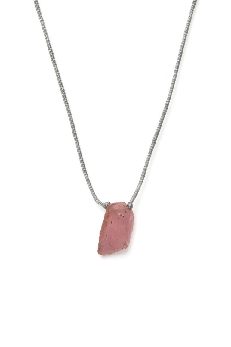 Raw pink sapphire necklace on gray satin cord and silver clasp.