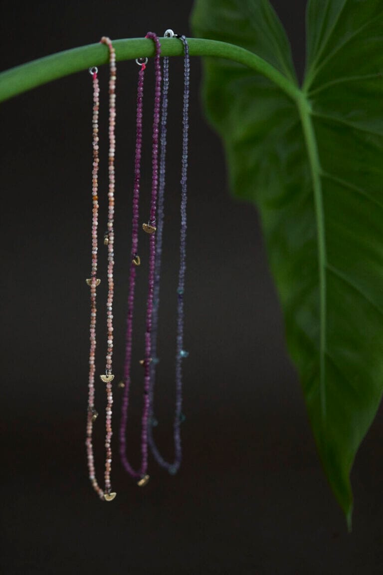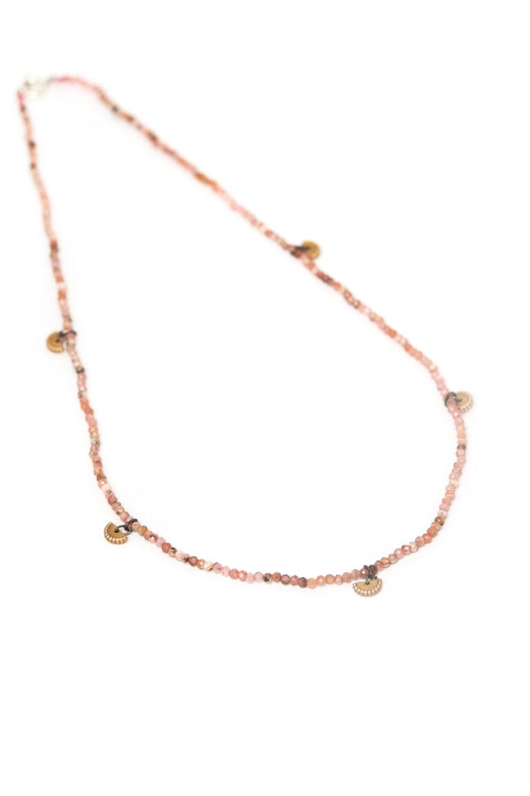 Necklace of rhodochrosite beads and bronze beads with silver clasp.