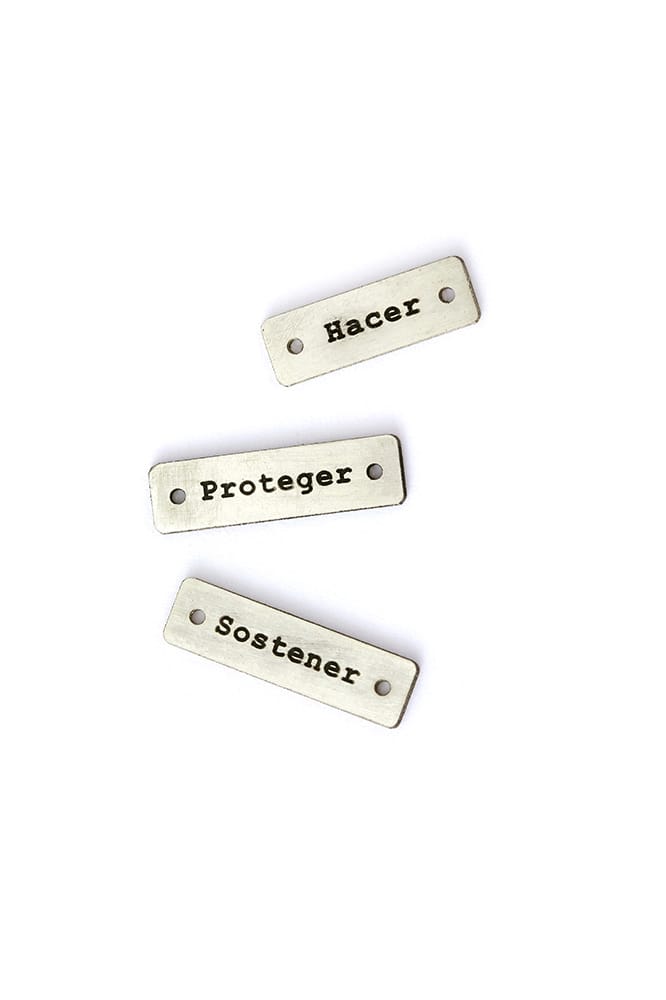 Arete, con cadenas de bronce con baño metalizado, con varios dijes en bronce, plata y turmalinas.
