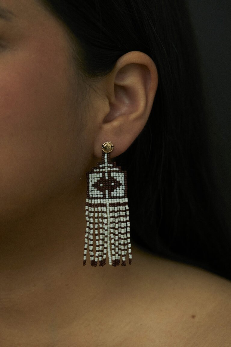 Arete patrón life tejido en mostacillas de Toho, bronce y plata.