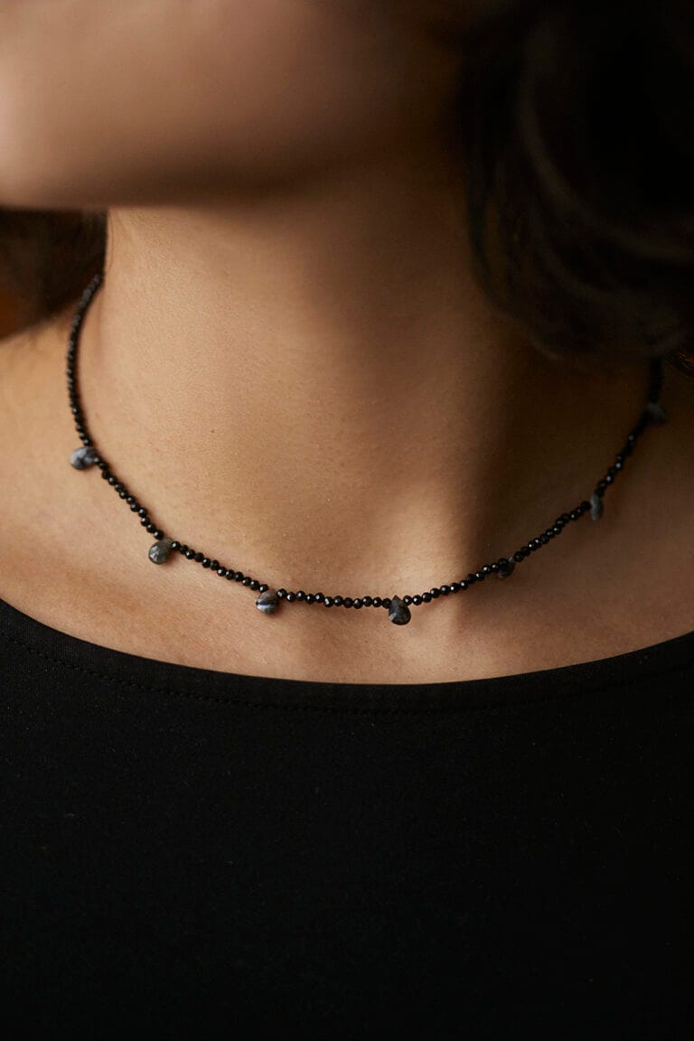 Collar Espinela negra y lagrimas de alexandritas y broche de plata.