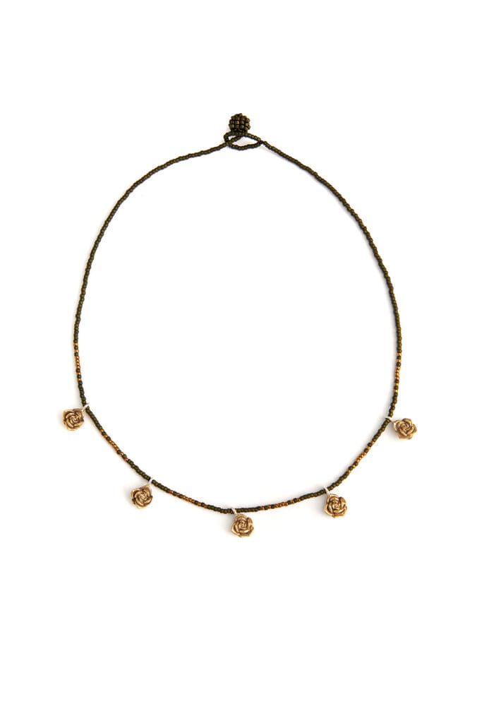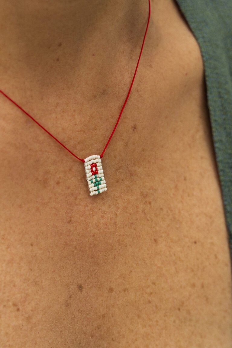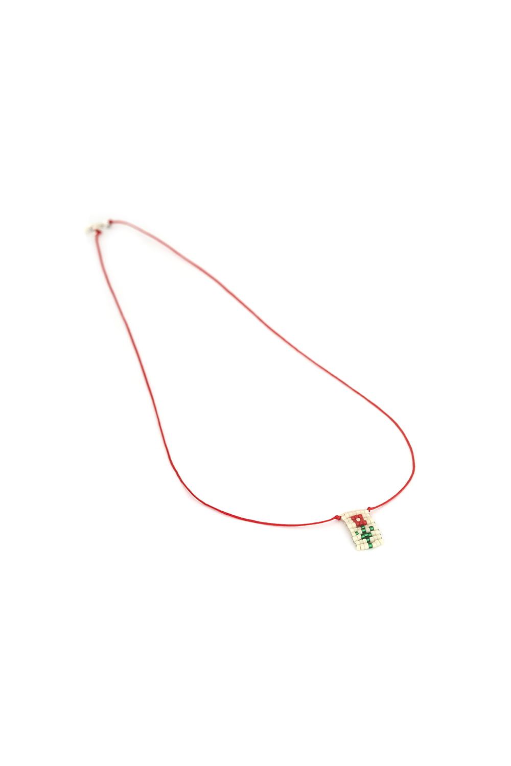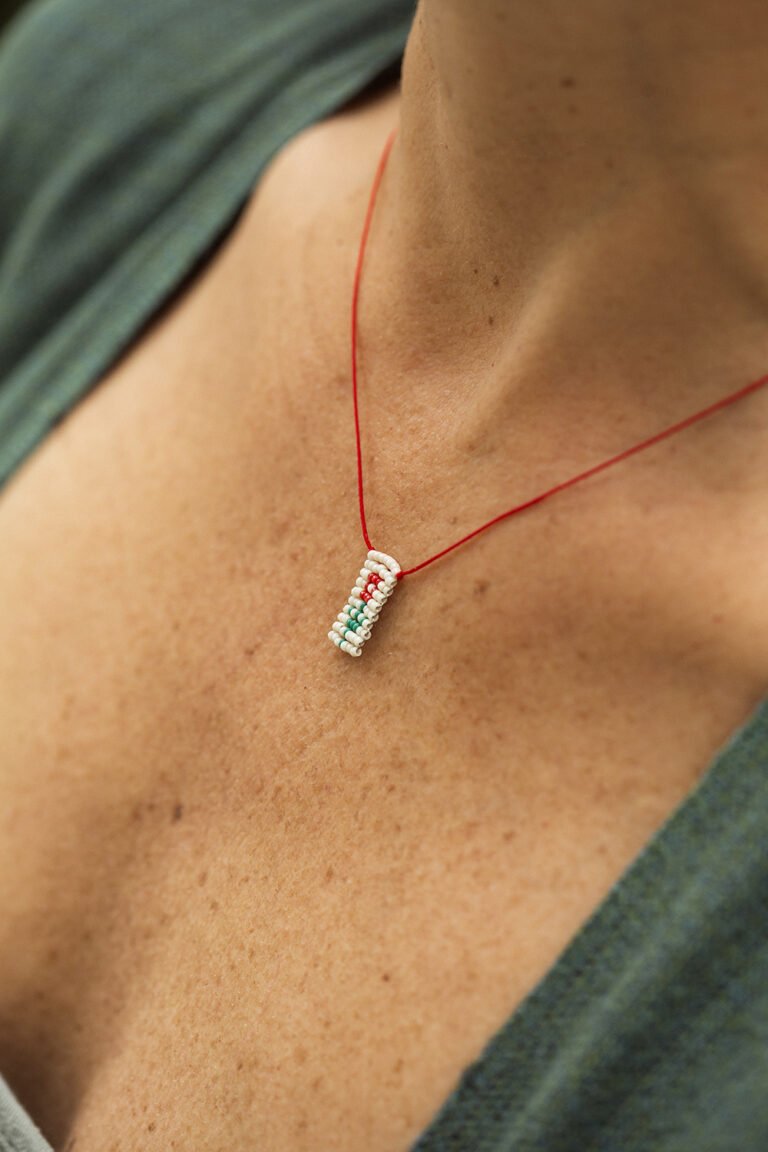 Collar con cordón de satín y dije tejido a con hilo de acero y mostacillas toho