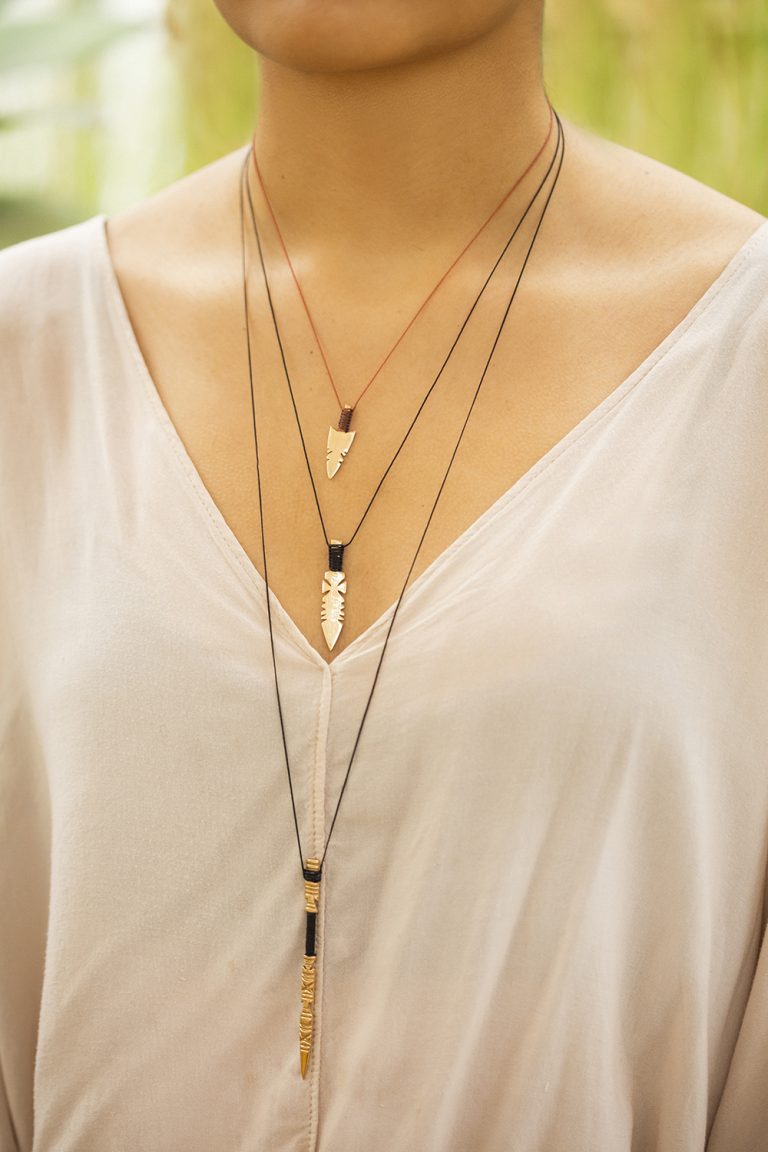 Largo: 42cm, Dije: 1x3 cm. Bronce y cordon de satin