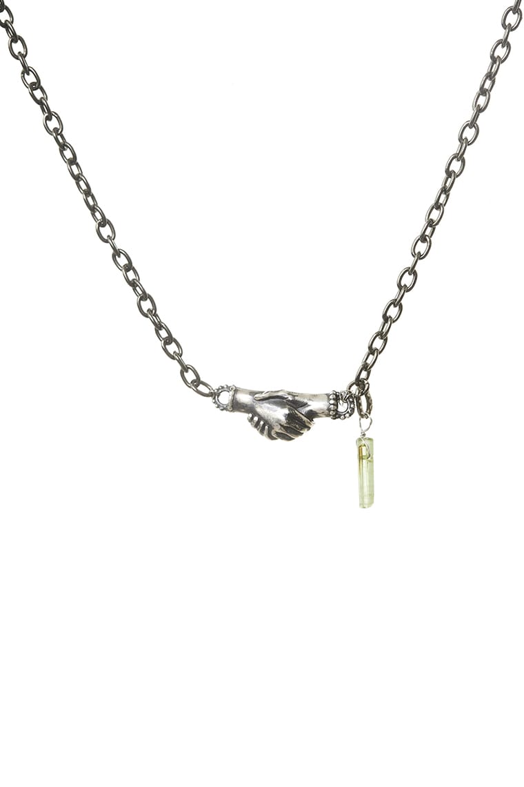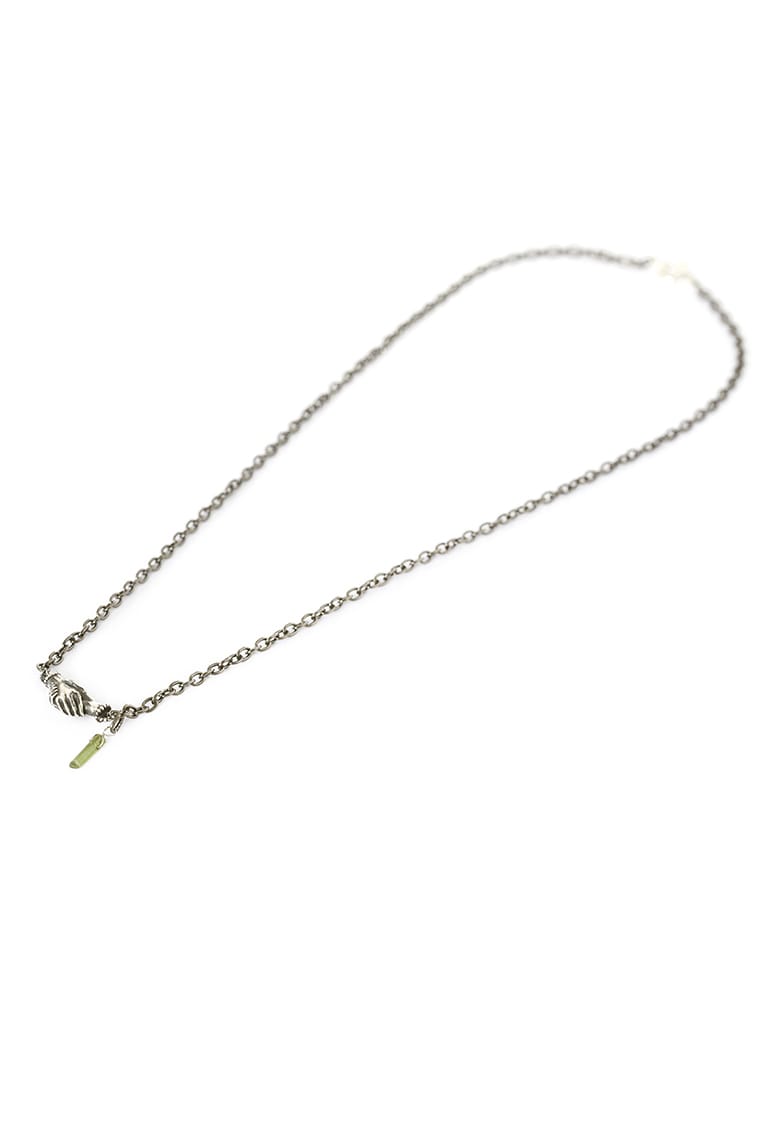Collar con cadena de bronce con baño metalizado, manos de plata y turmalina verde.