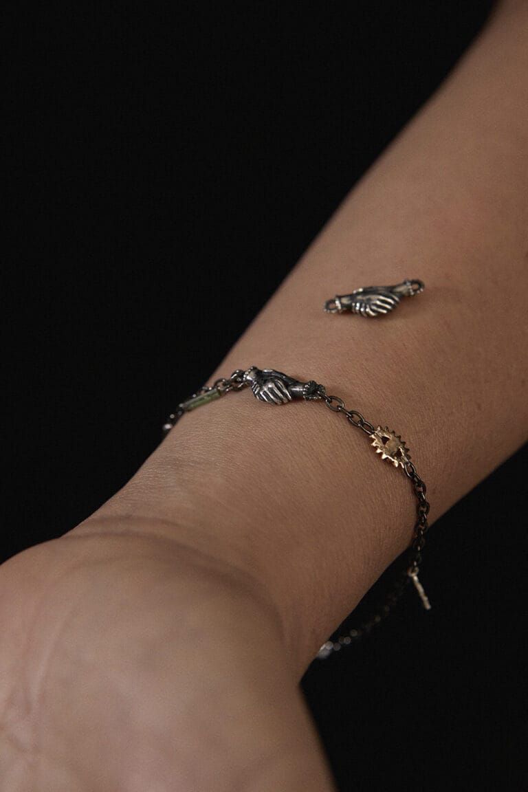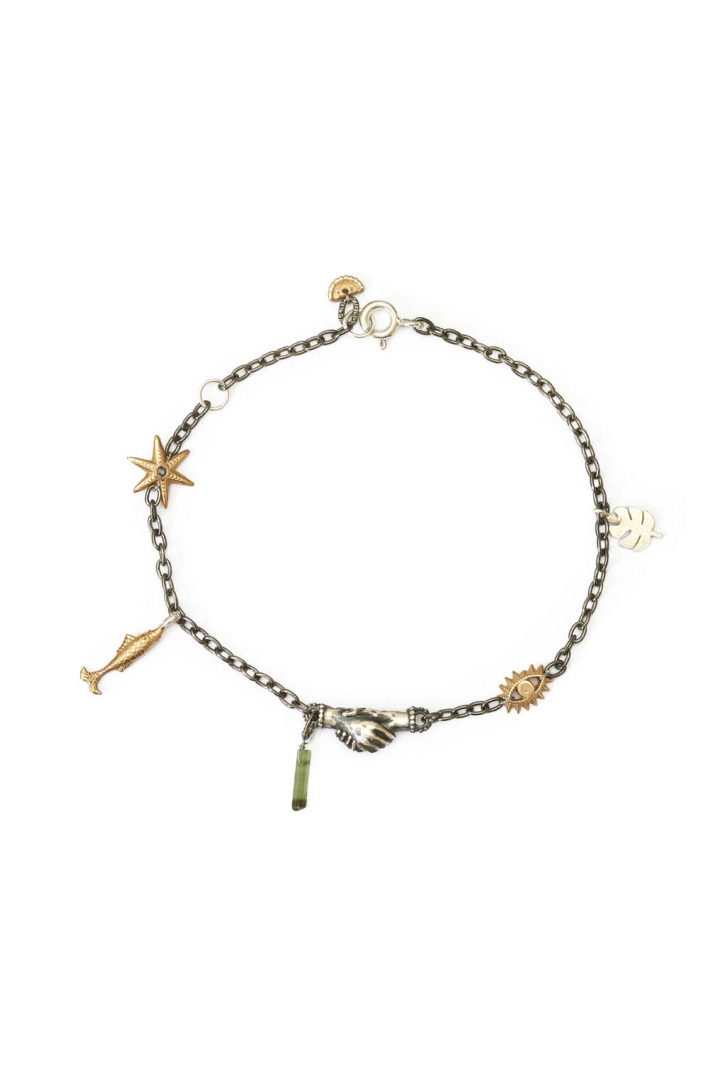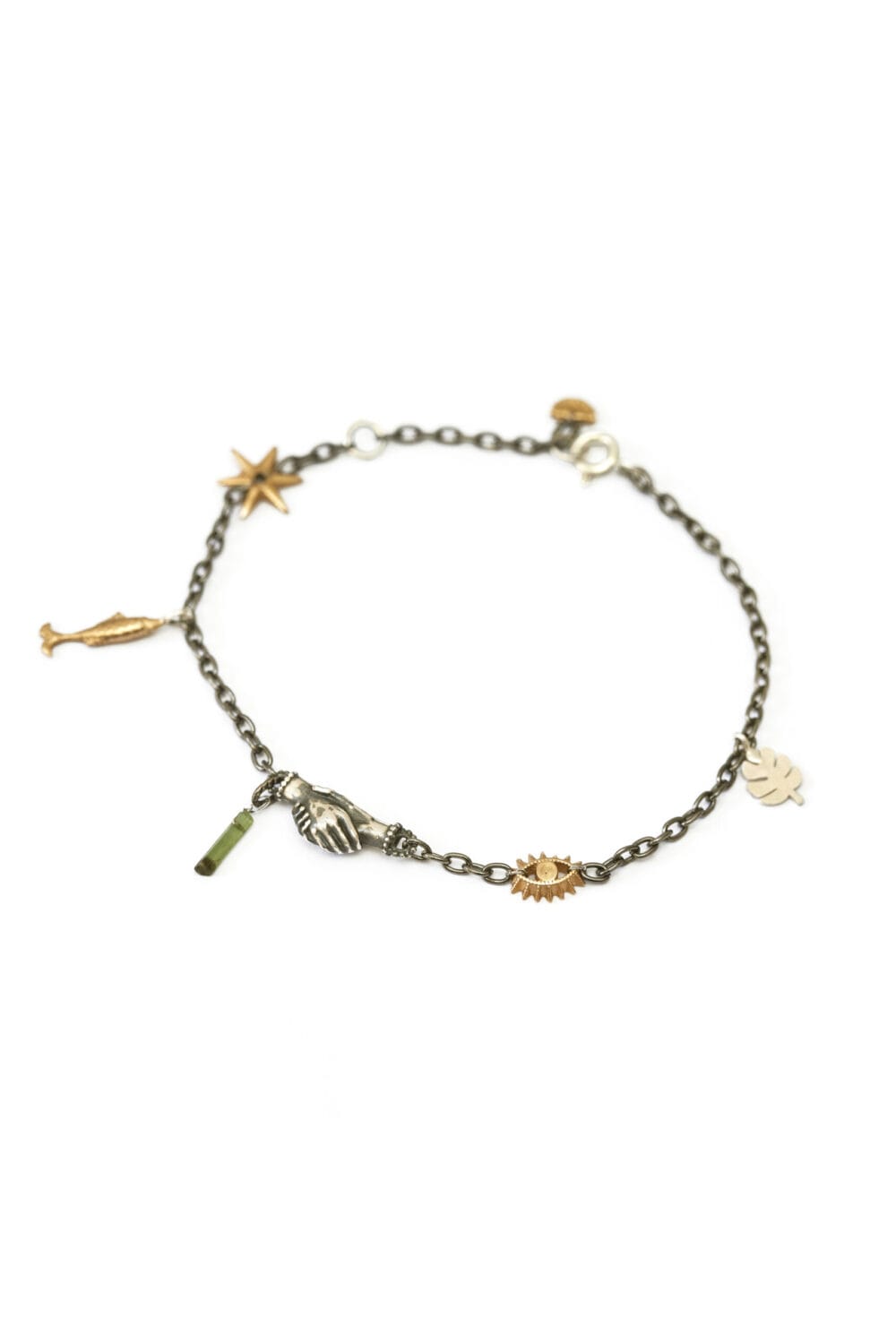 Pulsera con cadena de bronce con baño metalizado, cuentas de bronce , plata y turmalina.
